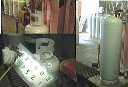 | LPガス等の高圧ガスを充てんした容器を、一定期間使用した容器について、 法に定める「技術上の基準」に合格しているか検査し、再塗装します。 |